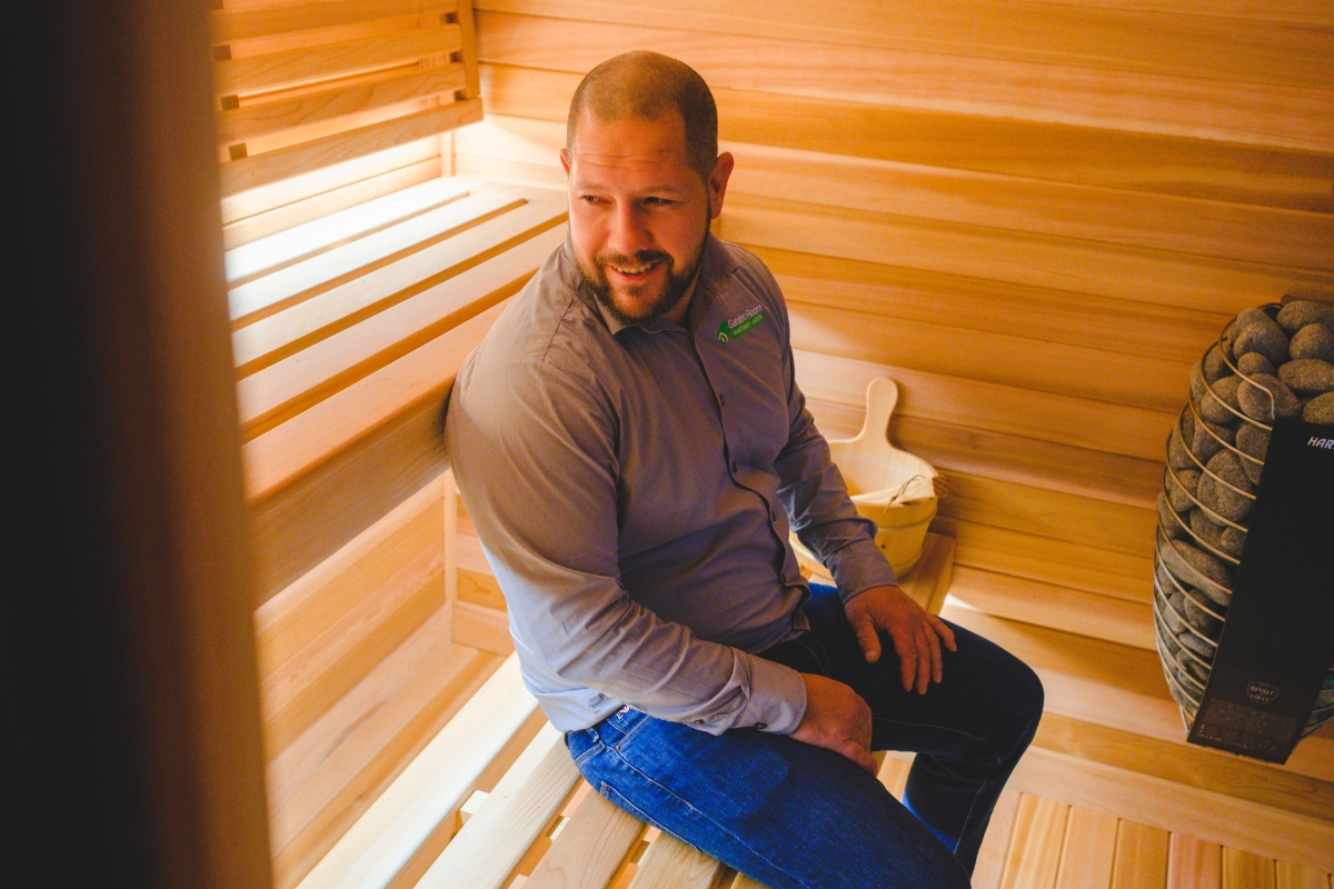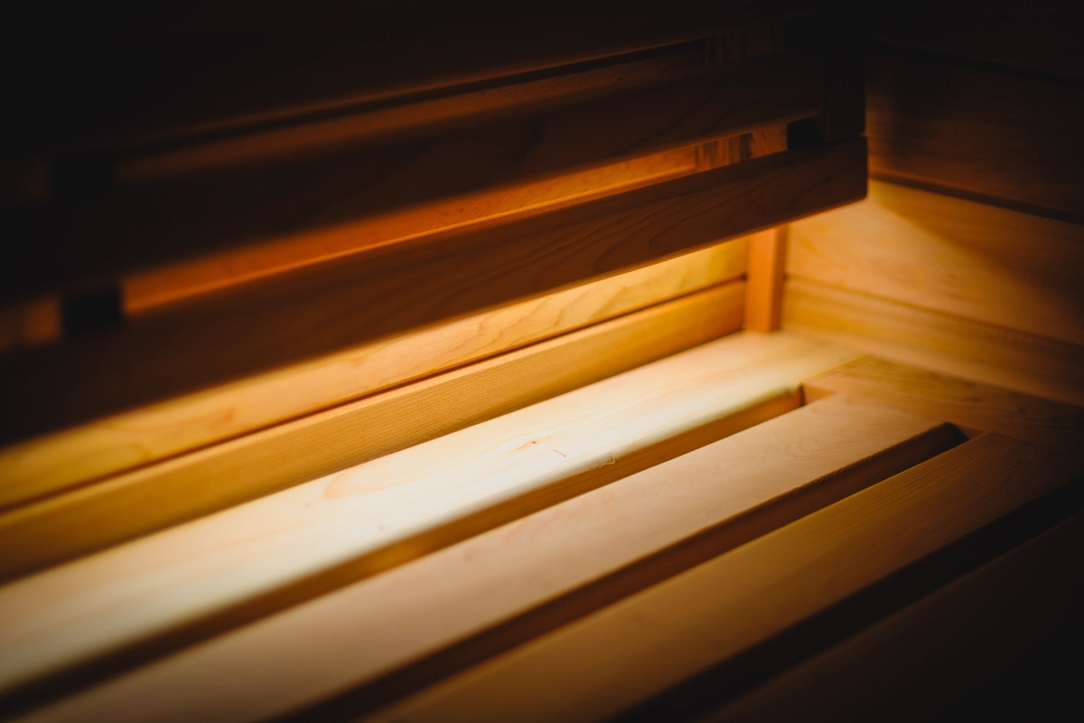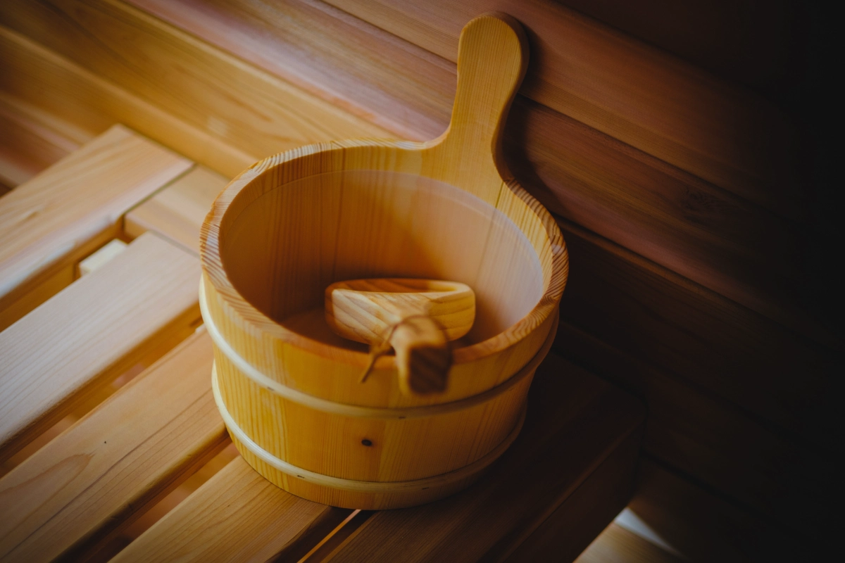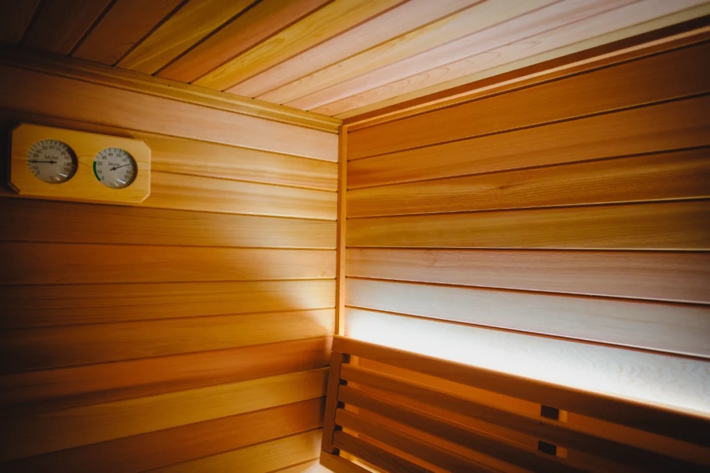Heating is provided by a Harvia 6kW electric Wi-Fi sauna heater, allowing reliable, even heat and easy control.
