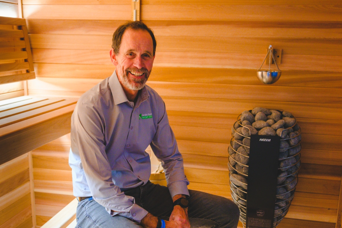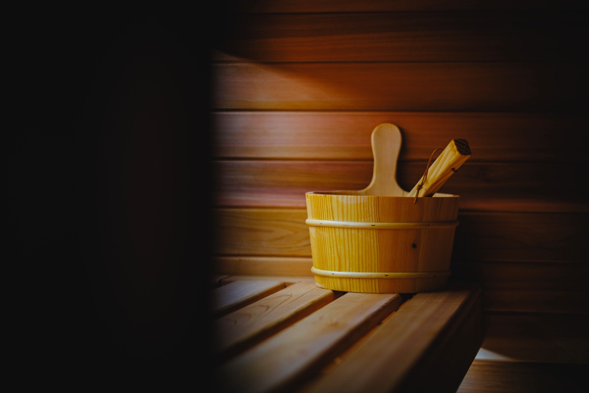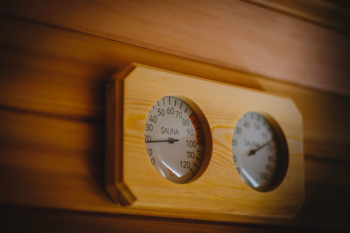 Heating is provided by a Harvia 6kW electric Wi-Fi sauna heater, allowing reliable, even heat and easy control.